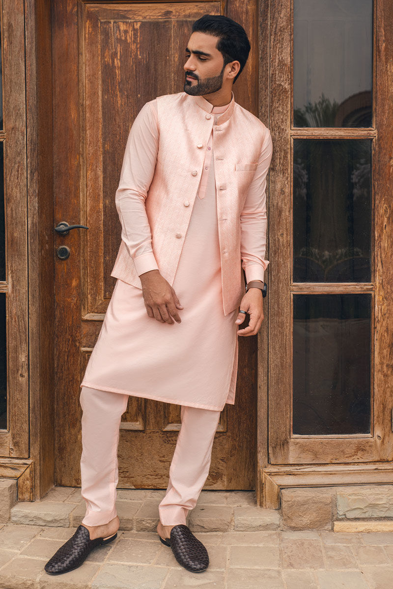 Rusan is a striking ensemble with its vibrant coral peach hue and statement waistcoat. The pastel-hued peach trouser Kurta set must add a manly touch to the overall look.