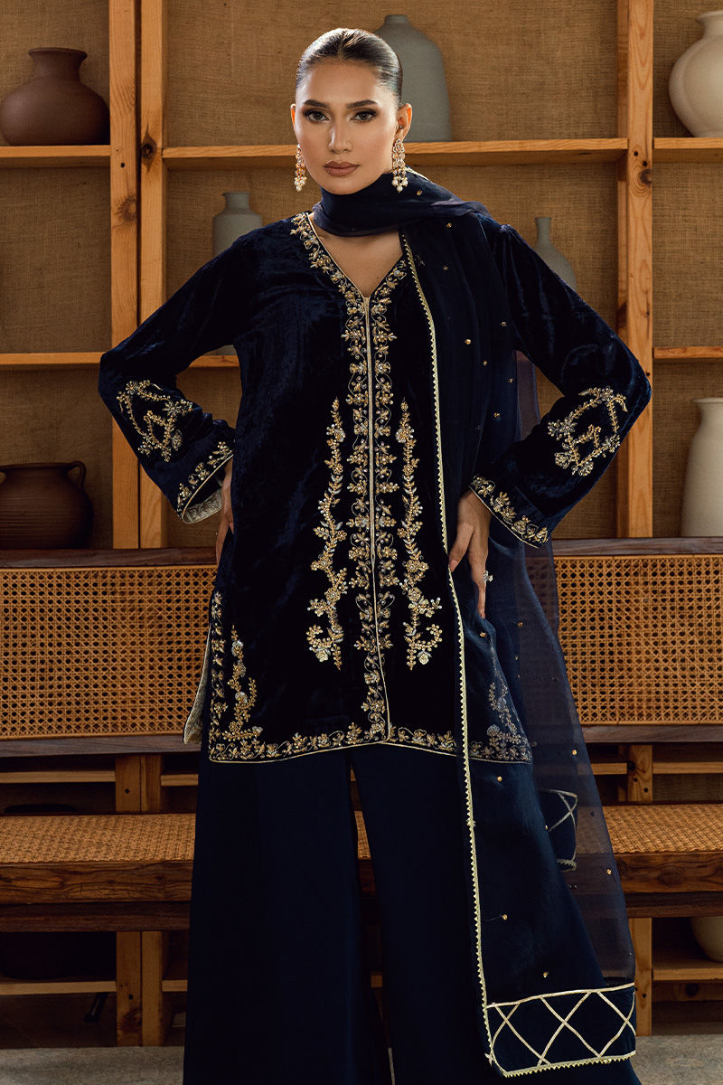 A statement of timeless poise and regal craftsmanship, Sapphire Legacy embodies the grace of deep sapphire tones blended with handcrafted finesse. The short shirt showcases exquisite handwork along the neckline, daman, and sleeves, reflecting hours of meticulous artistry and elite tailoring. Paired with a traditional silk gharara, this ensemble redefines classic elegance with a modern attitude. The organza dupatta, light yet opulent, adds a layer of ethereal charm—making Sapphire Legacy an ideal choice for formal soirées, festive occasions, and luxury gatherings. Bold yet graceful, Sapphire Legacy is designed for the woman who carries tradition with modern sophistication—a living portrait of strength and style.