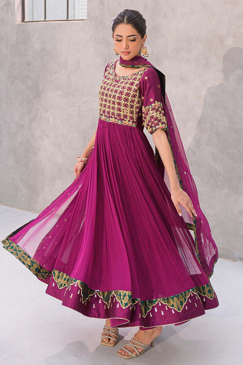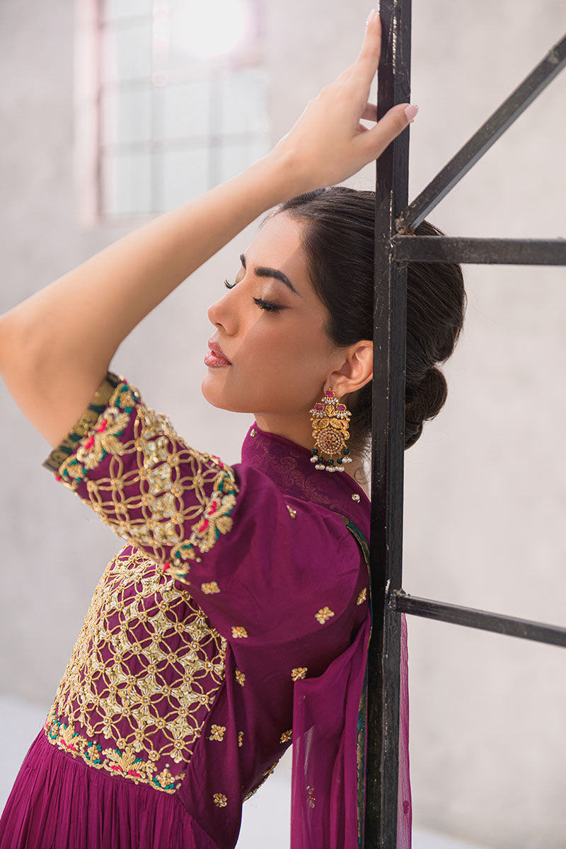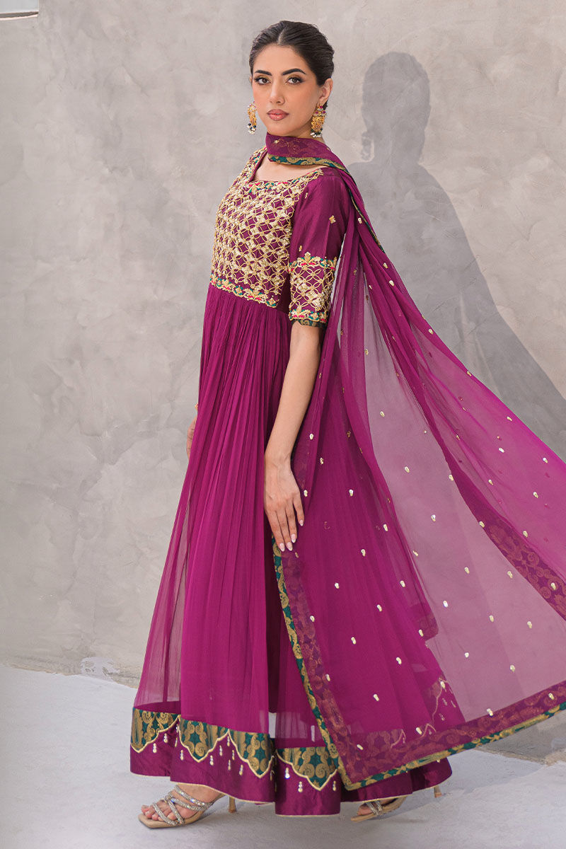 An enchanting plum-toned kalidar with a heavily embellished bodice in resham, zari, and sequins forming geometric floral patterns. The flowing panels are kept minimal with delicate scattered motifs, finished with an Embroidered border in deep green and gold. Paired with a matching dupatta and straight pants, this ensemble strikes the perfect balance of opulence and sophistication—ideal for receptions, formal dinners, and festive soirées.