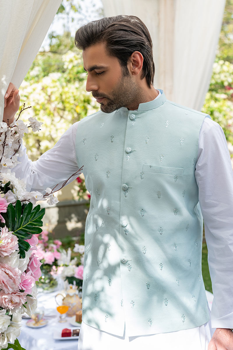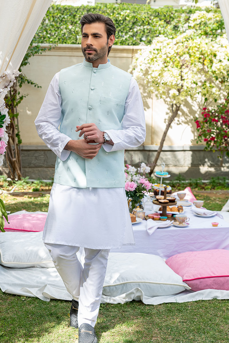 This article features a light blue embroidered vest coat paired with white kurta pajama
