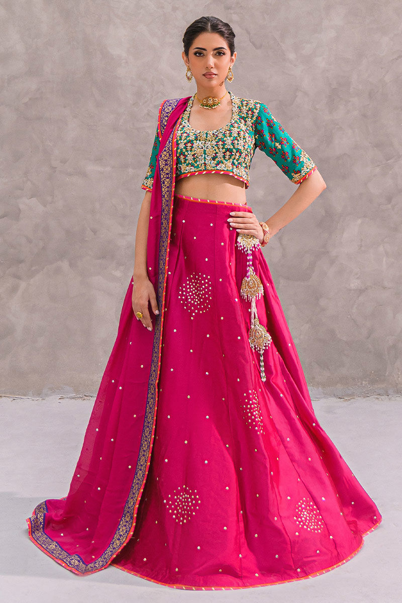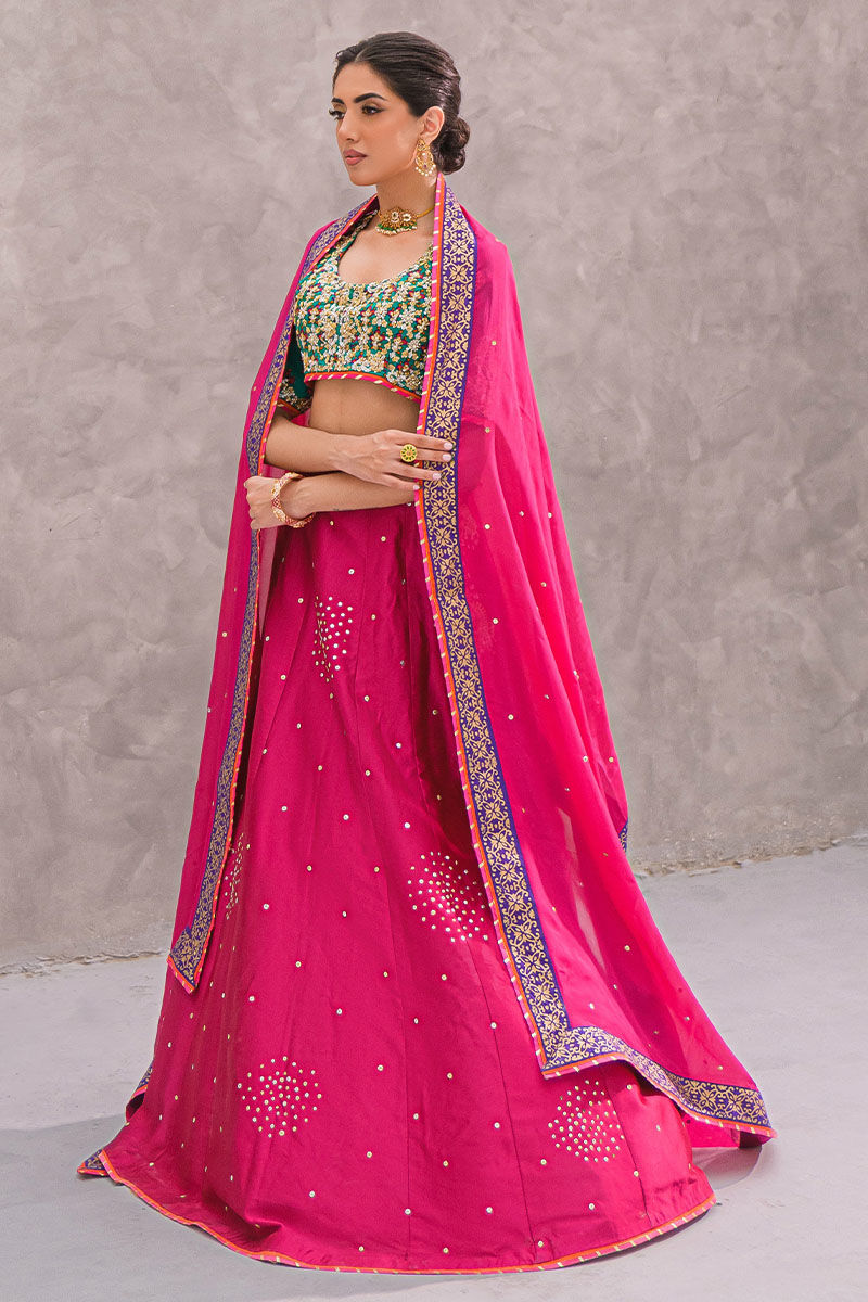 A vibrant magenta lehenga paired with a rich emerald green blouse, intricately hand-embellished with sequins, resham, and zari embroidery. The voluminous lehenga is adorned with delicate scattered motifs and bordered with intricate detailing, while tassel accents complete the regal look. This ensemble radiates festive grandeur—ideal for mehndi nights and celebratory evenings.