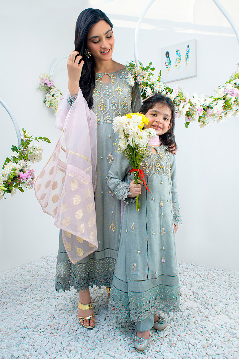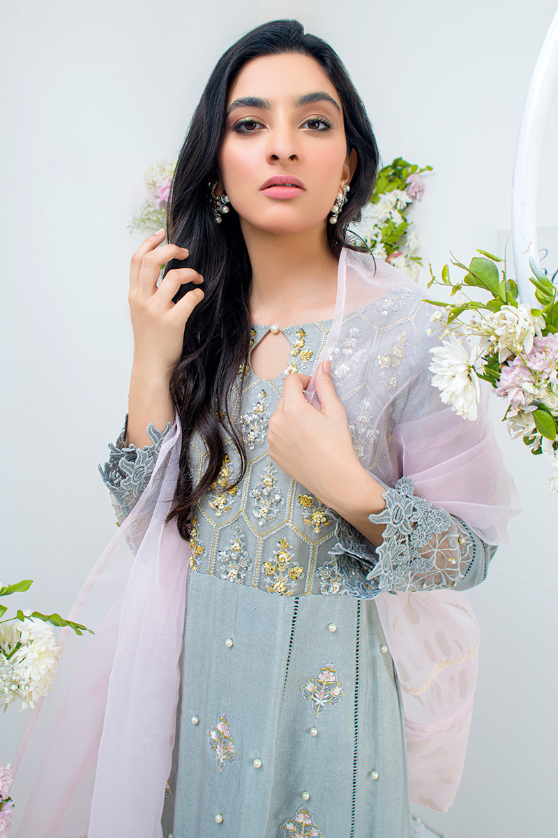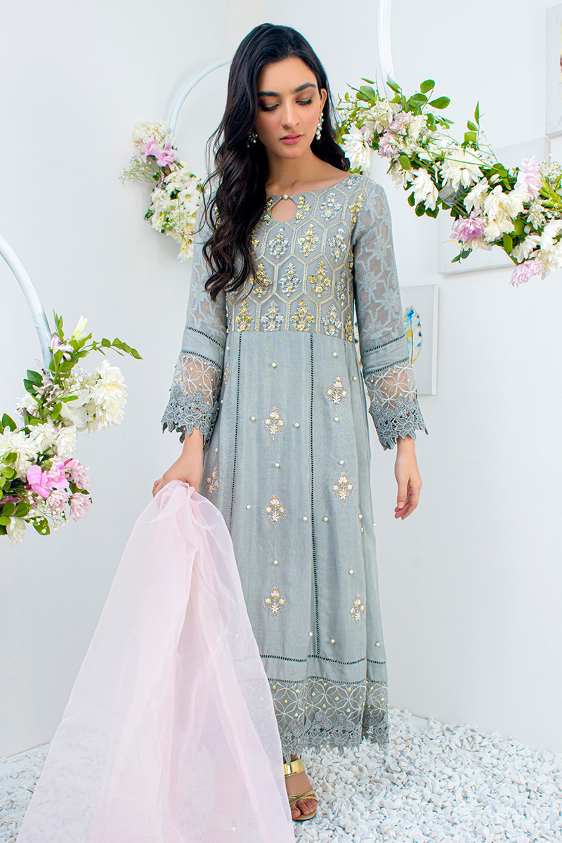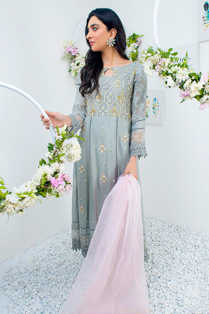 Color: Light Grey Fabric: Khaddi Net Work Details: Embellished
