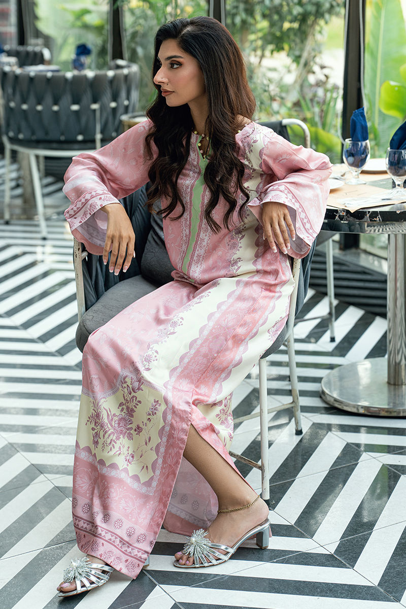 This elegant kaftan is crafted in a soft blush pink base, beautifully contrasted with ivory panels and borders. The design features a delicate digital floral print in harmonious tonal shades, creating a refined and feminine aesthetic.