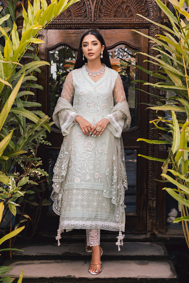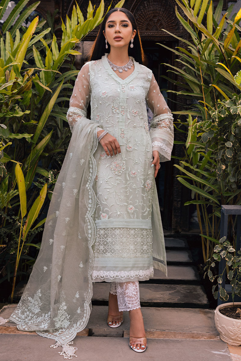 Feeling like a blooming daisy in this exquisite mint organza dress! The intricate ari embroidery and delicate hand embroidered motifs create a whimsical, dreamy vibe. The delicate organza dupatta adds a touch of femininity while the straight trousers add structure to the outfit.
