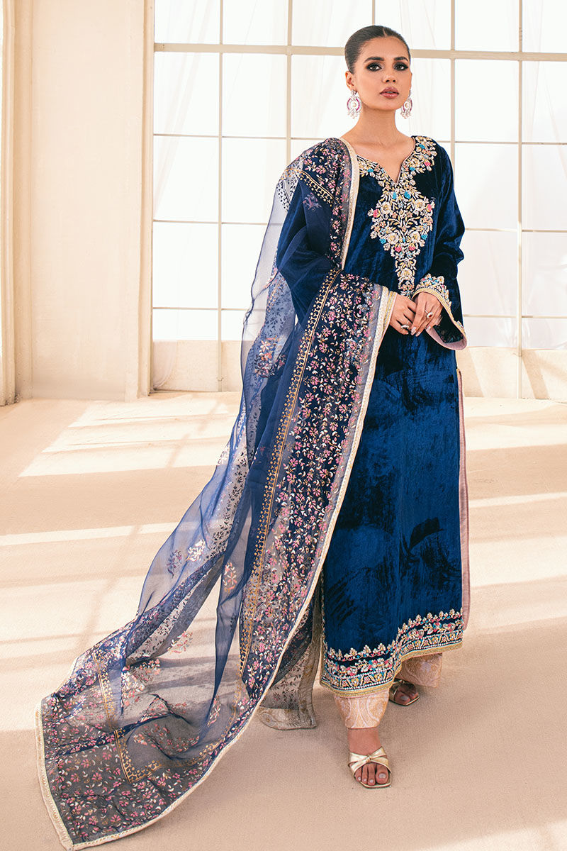 The Topaz Blue from your Yalina collection is a luxurious and opulent choice for the winter season. The shirt is crafted from plush velvet, which not only adds warmth but also exudes a sense of richness and elegance. It’s further enhanced with intricate handwork on the neckline, sleeves, and daaman, giving it a unique and artisanal touch. To complete the look, the pant is made from jamawar, a fabric known for its intricate patterns and a touch of glamor. The organza dupatta is a perfect complement to the ensemble, featuring a beautiful block print that adds visual interest and a touch of artistry. The lace trimmings on all four edges of the dupatta add a delicate and feminine touch to the overall look.