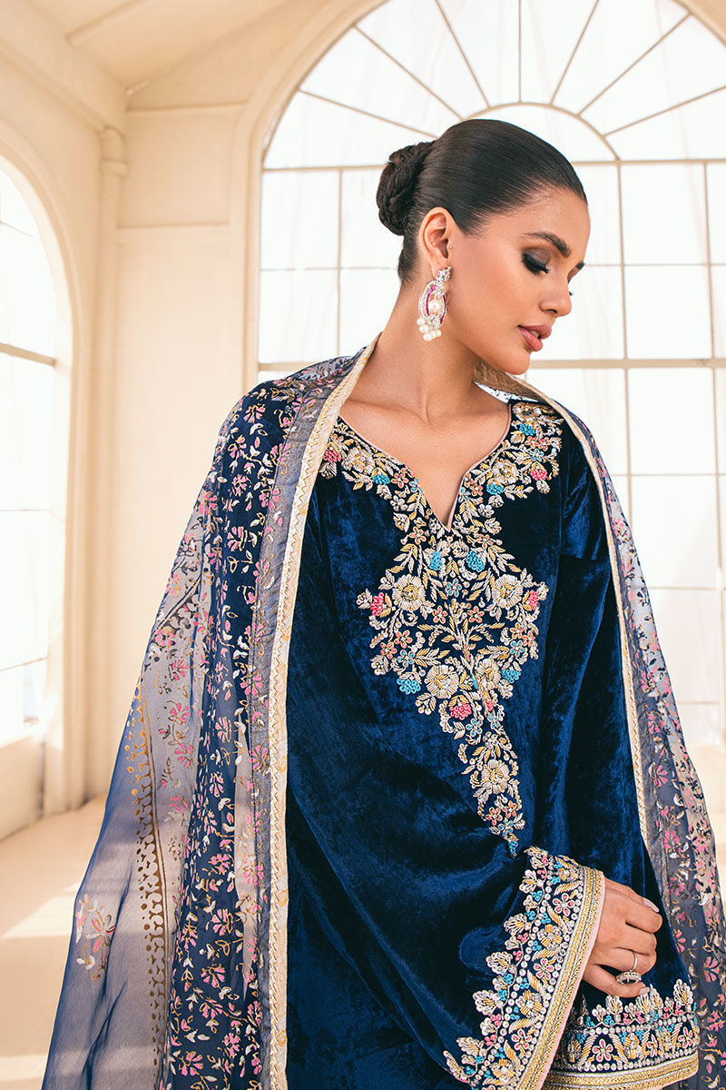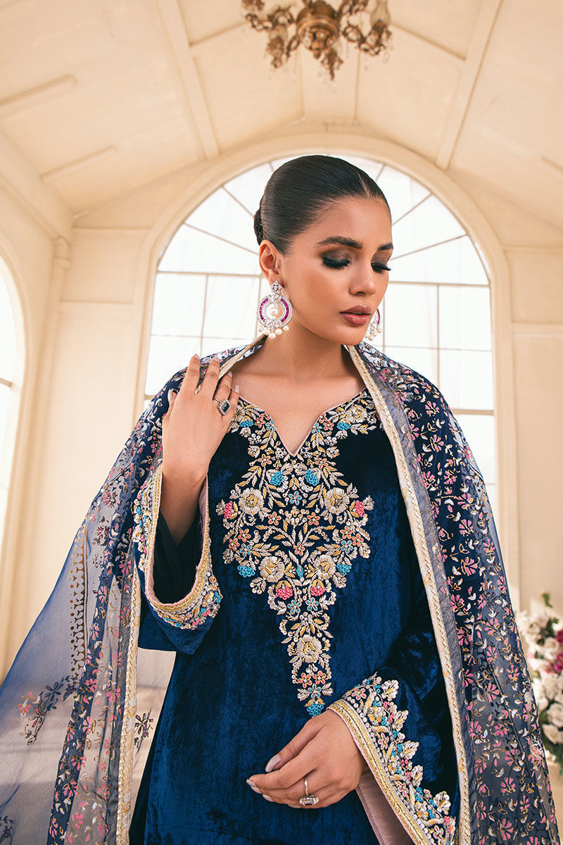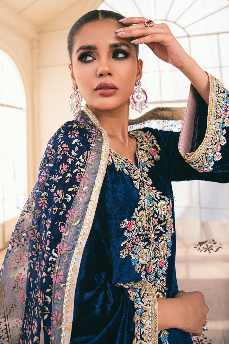 The Topaz Blue from your Yalina collection is a luxurious and opulent choice for the winter season. The shirt is crafted from plush velvet, which not only adds warmth but also exudes a sense of richness and elegance. It’s further enhanced with intricate handwork on the neckline, sleeves, and daaman, giving it a unique and artisanal touch. To complete the look, the pant is made from jamawar, a fabric known for its intricate patterns and a touch of glamor. The organza dupatta is a perfect complement to the ensemble, featuring a beautiful block print that adds visual interest and a touch of artistry. The lace trimmings on all four edges of the dupatta add a delicate and feminine touch to the overall look.