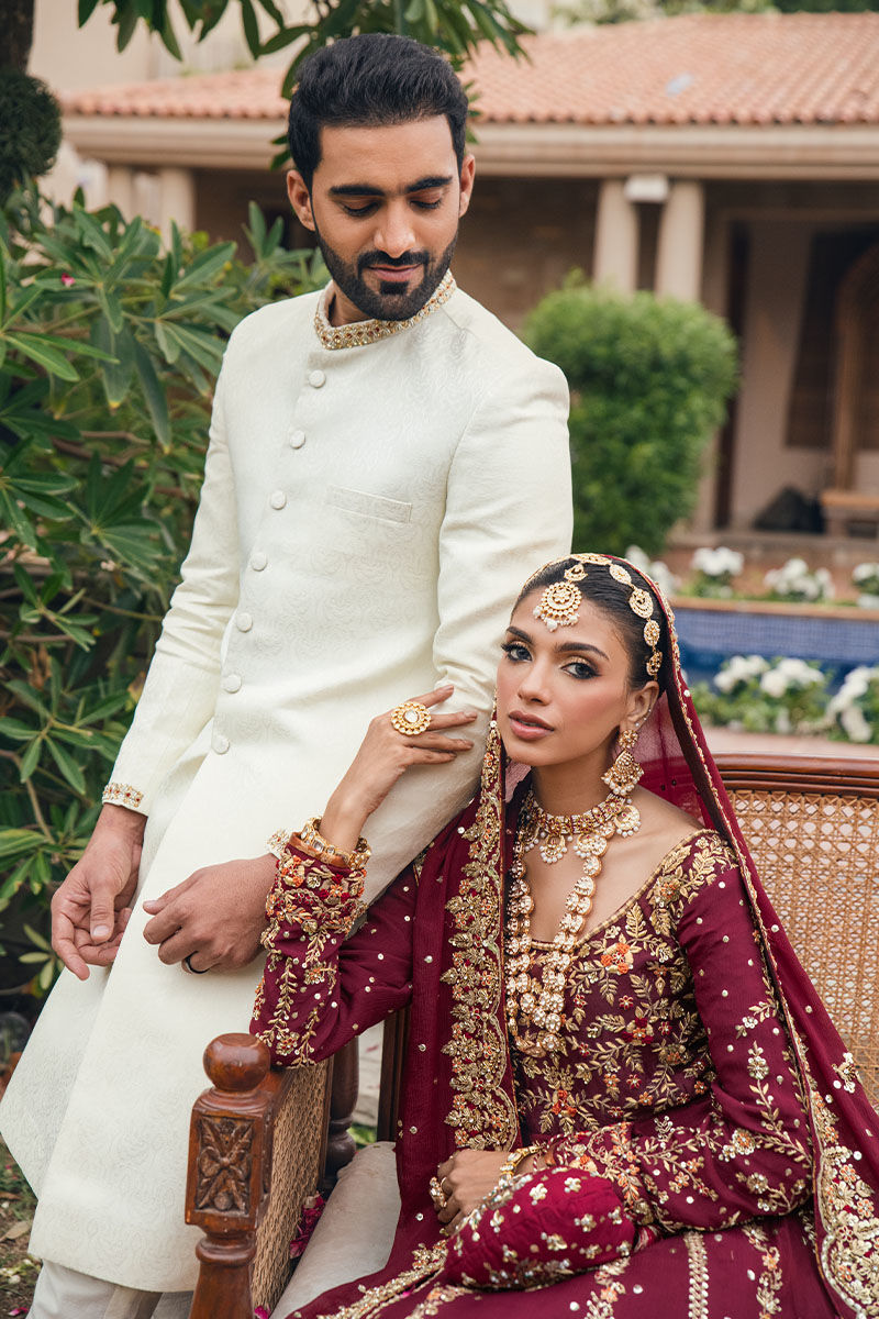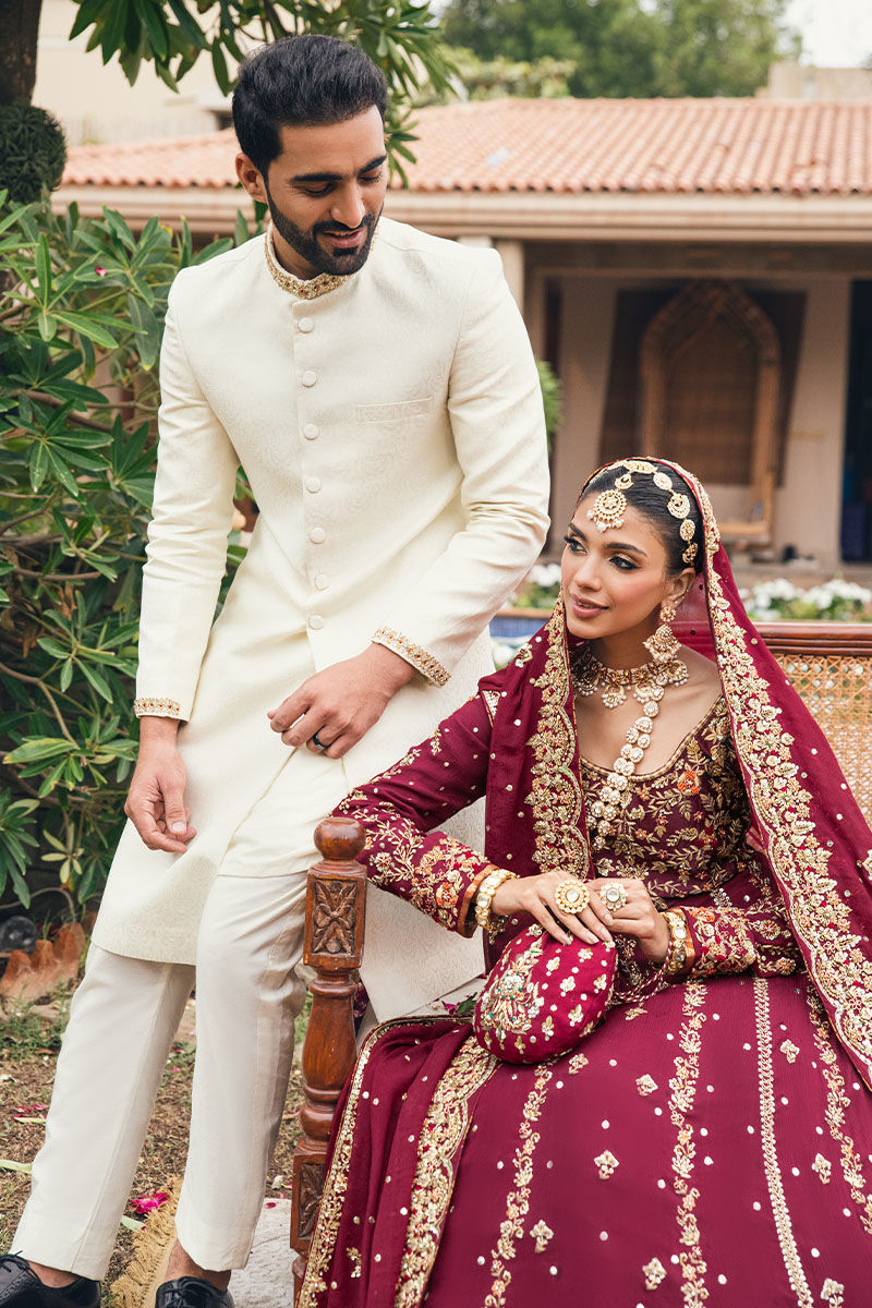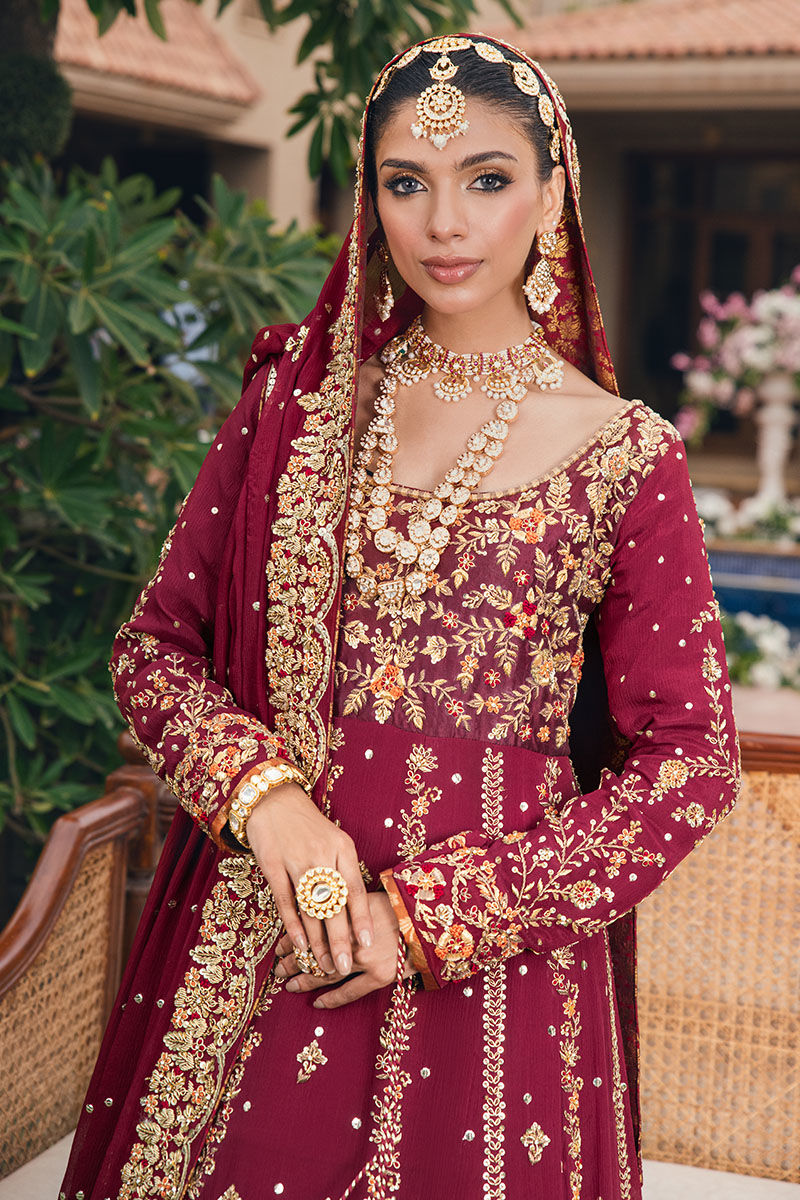 The maroon heavily worked shirt radiates regal elegance with its intricate detailing. Floral motifs and gold bead work adorn the neckline and sleeves. The shirt is paired with an embellished farshi sharara. Completing the bridal look is a matching maroon dupatta adorned with resham and a heavily worked border. This ensemble exudes timeless beauty and sophistication.