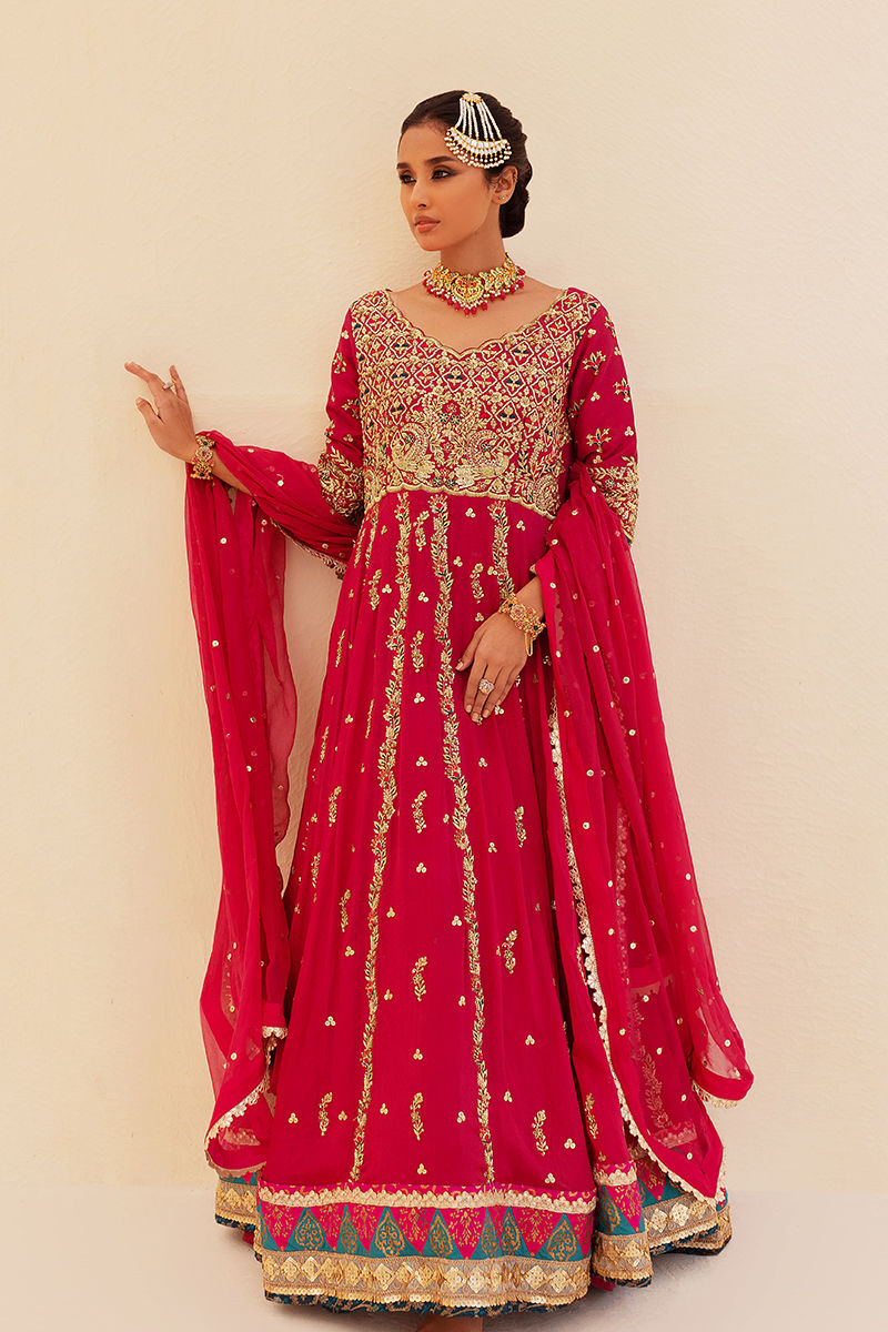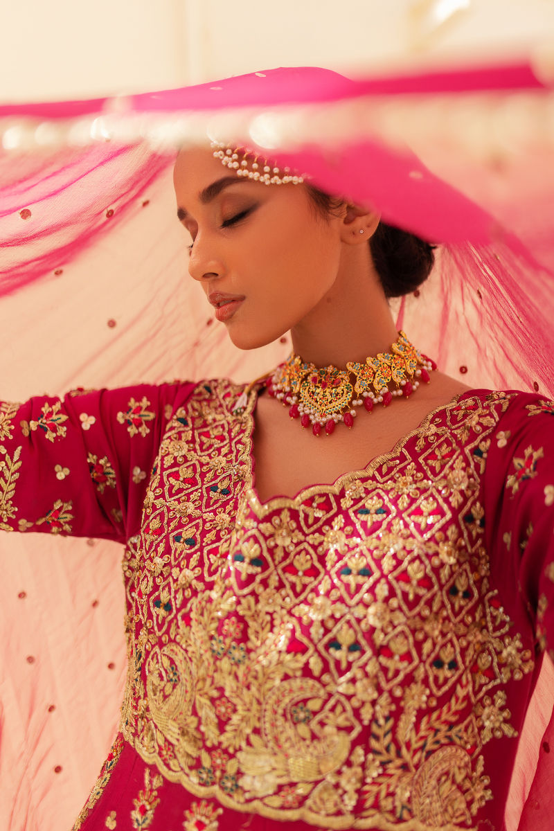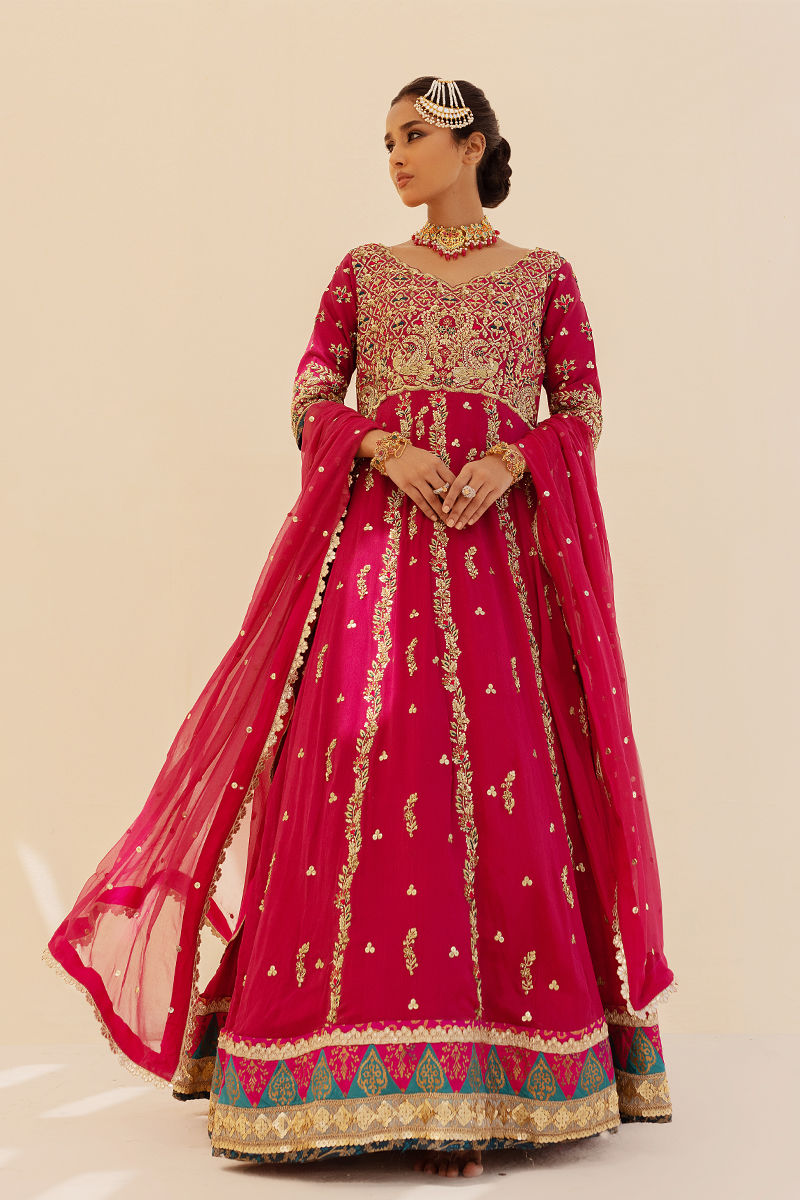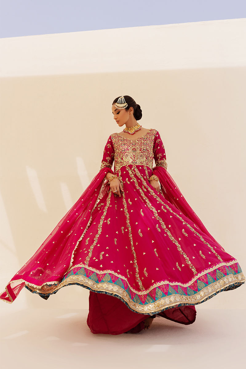 A three piece kalidaar pishwas in plum pink wrought using a richly khaadi chiffon fabric featuring heavily embellished handwork eith blockprinted hem line and glistening embellishment laces.