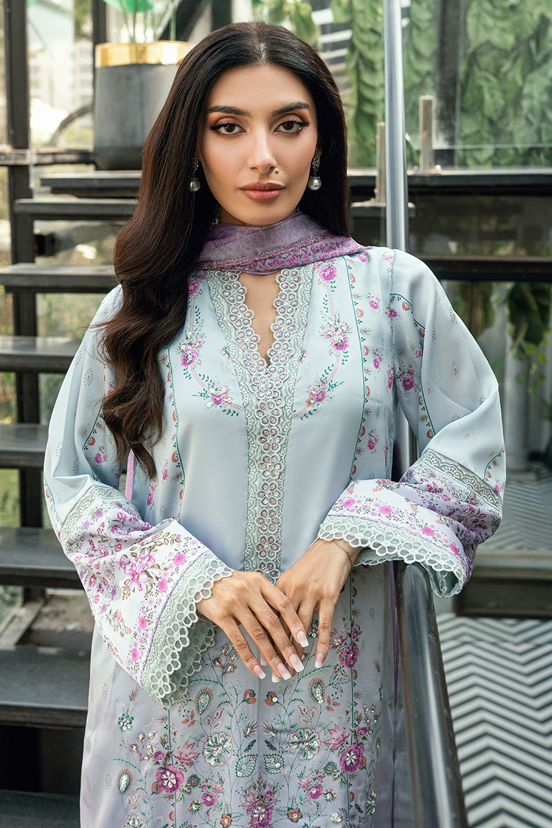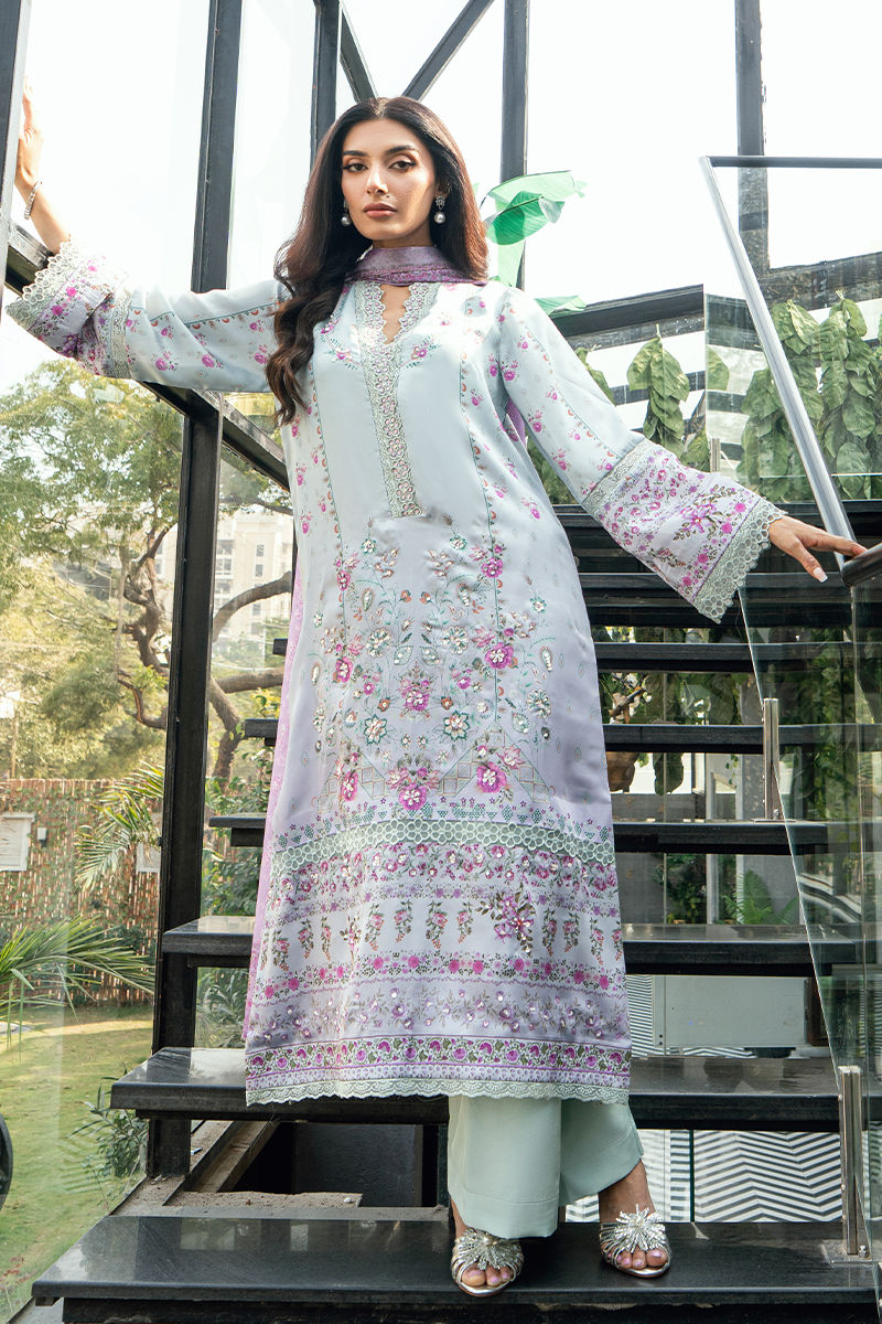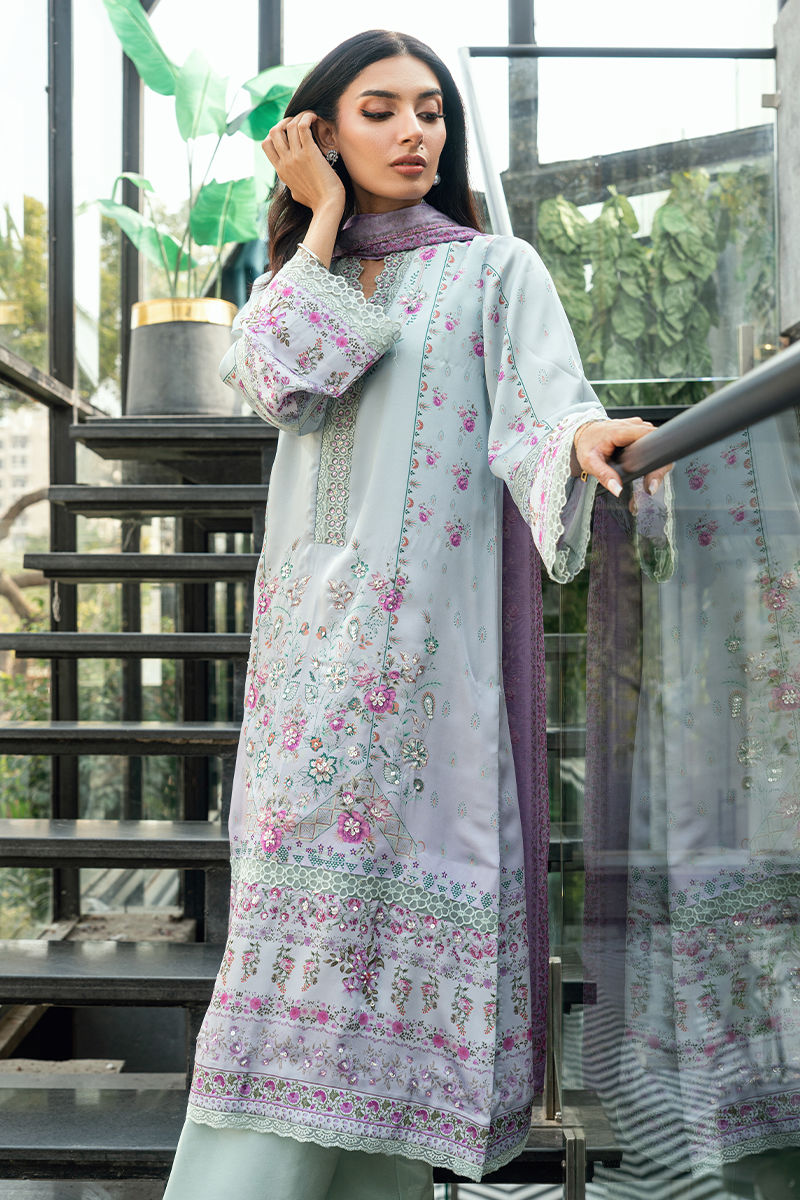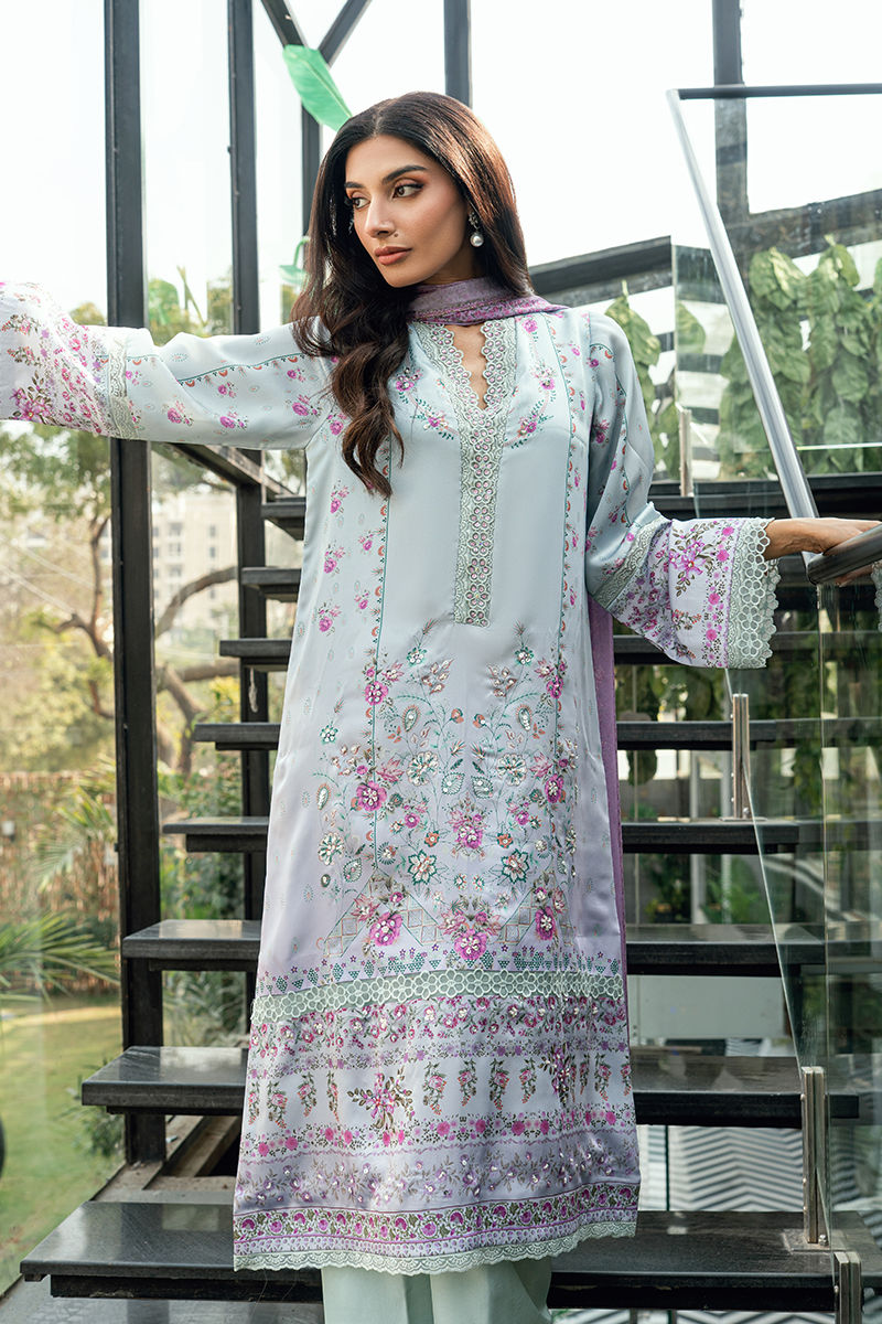 This elegant long shirt is crafted on a refreshing powder blue base, adorned with delicate digital floral prints in shades of blush pink, lilac, lavender, soft rose, mint green, and ivory. The soothing pastel palette creates a graceful and festive appeal, perfect for daytime celebrations. The neckline is beautifully highlighted with intricate embroidery and subtle embellishments, adding refined sparkle without overwhelming the design. Lace detailing on the sleeves and daman enhances the feminine silhouette, while the thoughtfully placed floral borders bring balance and depth. The look is completed with a coordinated dusty-lilac dupatta and matching trousers, offering a polished, harmonious finish.