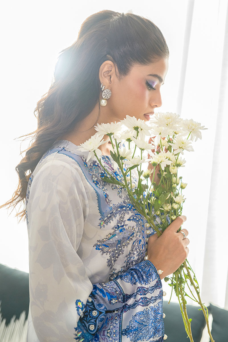 This modern article features a white and blue printed floor length kaftan with long flared sleeves and an embroidered and embellished neckline and sleeves all finished with pearl details.