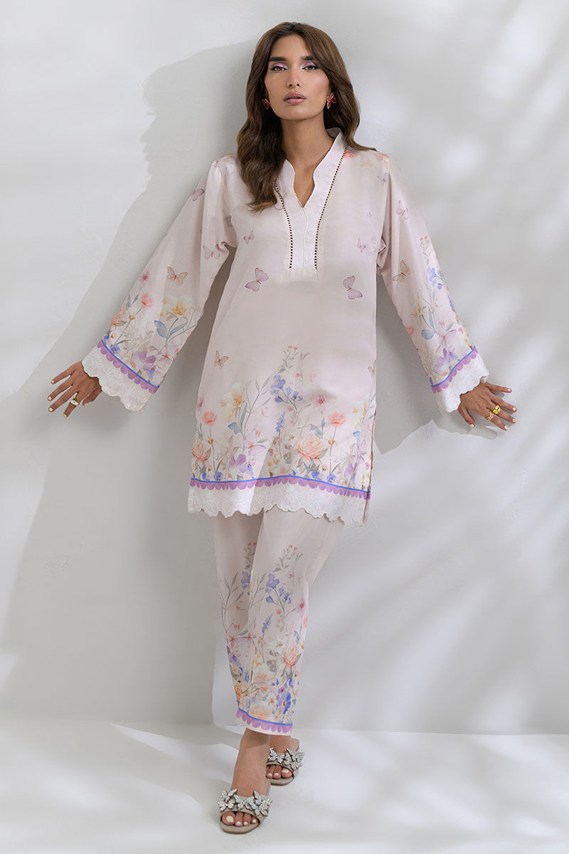 Embrace a delicate and feminine feel with this Swiss lawn co-ord set that offers a soft touch with its pale blush base and peach and purple accents. The kurta is cut in a classic straight silhouette with a unique overlap neckline and cutwork detaling at the hem and sleeves, paired with tailored trousers for a graceful finish making it perfect for tea parties or daytime festivities