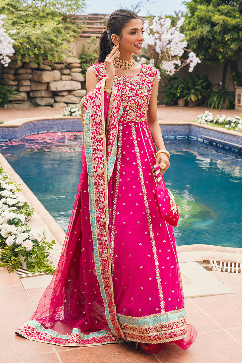 The exquisite kalidar is meticulously crafted from delicate silk and net, embellished with gold and antique work, showcasing a dazzling interplay of dabka and sequins. Paired with a silk lehenga, this ensemble radiates regal charm. The net embellished dupatta complements the look, featuring laces borders on all sides, adding a touch of tradition. With its graceful, sophisticated, and captivating design, ‘Yara’ is the ideal choice for your special Mehndi celebration.