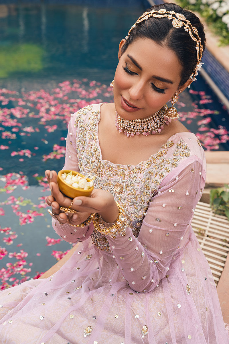 The pink net bodice kalidar is beautifully adorned with a blend of handwork, machine embroidery, and dabka detailing on the shirt. It's elegantly paired with a net dupatta featuring chan and booti patterns, along with a matching jamawar lehenga. The ensemble boasts intricate craftsmanship and a harmonious blend of elements, making it a stunning choice for any occasion.